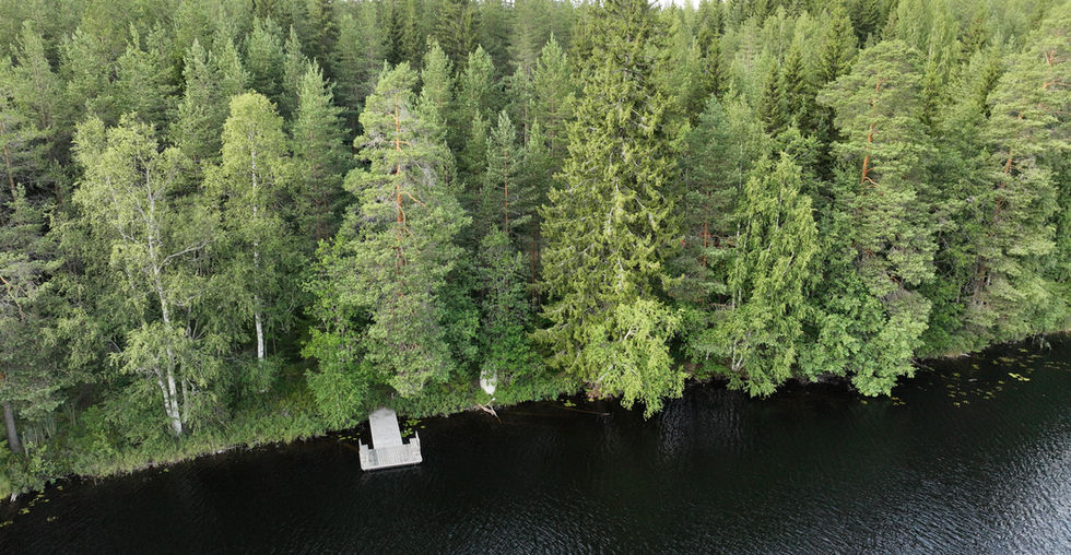 Kangasmaasto, hieman pusikoitunut päärakennuksen ja rannan väliltä.